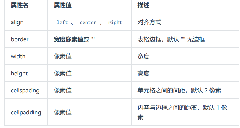 注:cellpadding:内容与边框之间的距离,默认 1 像素;cellspacing:单元格之间的间距,默认 2 像素。