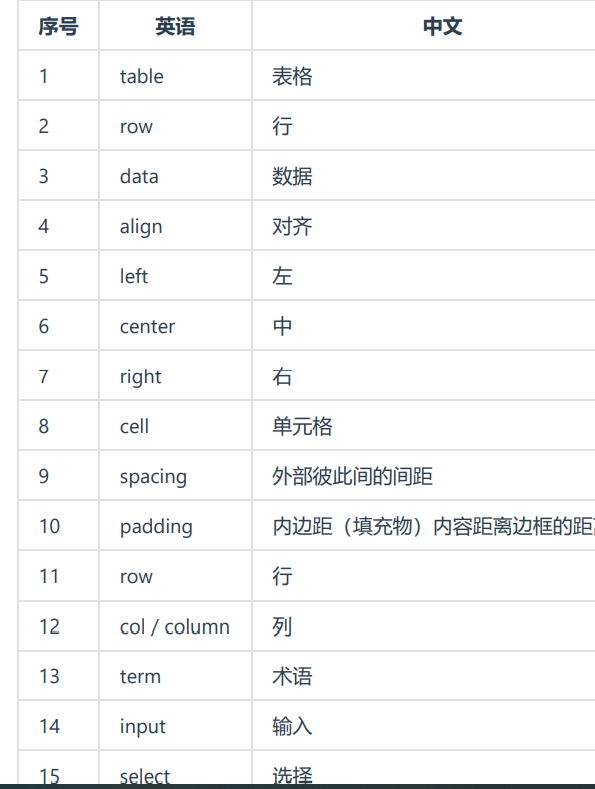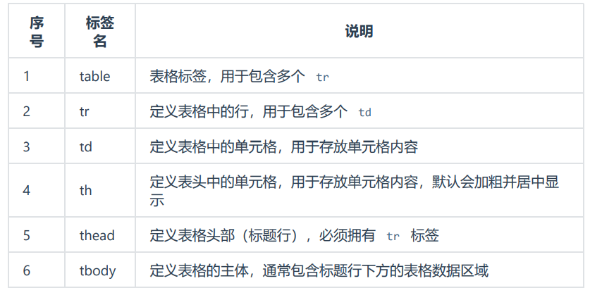 4、表格结构标签:thead 定义表格头部(标题行),必须拥有 tr 标签,一般位于第一行;tbody 定义表格的主体,通常包含标题行下方的表格数据区域。