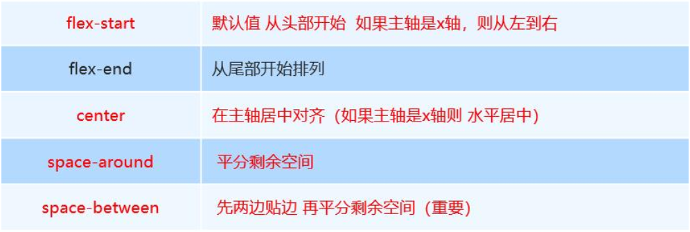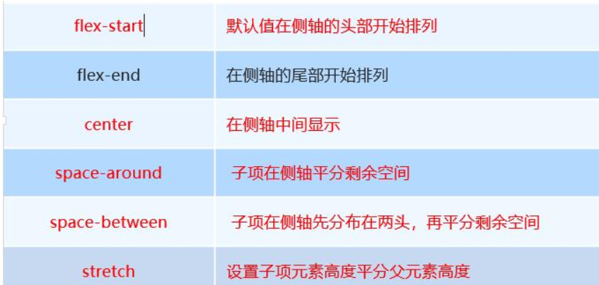 align-content:flex-start/center/space-between/space-around/strech 多行 设置侧轴子元素从头开始排列/居中显示/子项在侧轴线分布在两头,在平分剩余空间/子项在侧轴平分剩余空间/设置子项元素高度平分父元素高度