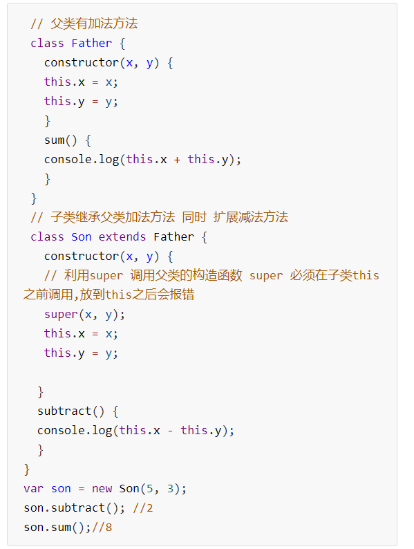 (3)如果子类想要继承父类的方法,同时在自己内部扩展自己的方法,利用super 调用父类的构造函数,super 必须在子类this之前调用