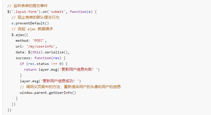(5)更新成功之后,调用父页面中的方法,重新渲染用户的头像和用户信息