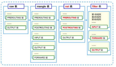 1.四表:Raw(跟踪)、mangle(标记)、nat(修改)、fliter(过滤)