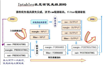 优先级次序:Raw(跟踪)>mangle(标记)>nat(修改)>fliter(过滤)