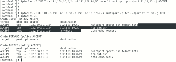 iptables -I INPUT -s 192.168.10.0/24 -d 192.168.10.50 -m multiport -p tcp --dport 22,23,80 -j ACCEPT