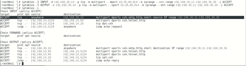 iptables -I OUTPUT -s 192.168.30.10 -p tcp -m multiport --sport 22:25,80,514 -m iprange --dst-range 192.168.30.11-192.168.30.30 -j ACCEPT