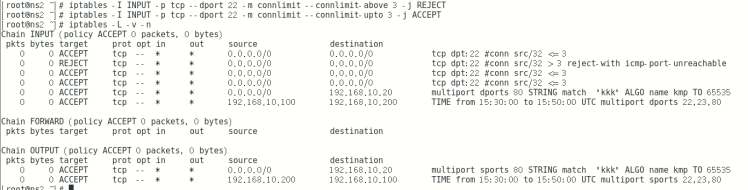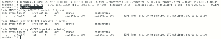 iptables -I OUTPUT -s 192.168.10.200 -d 192.168.10.100 -m time --timestart 15:30 --timestop 15:50 -m multiport -p tcp --sport 22,23,80 -j ACCEPT