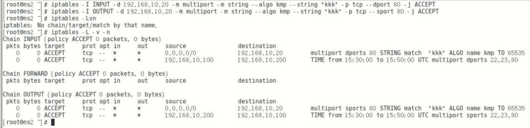 Input链 目的ip 10.20 启动multiport模块 源端口80 启动匹配字符串模块 匹配kkk通过