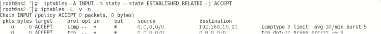 input链 目的ip10.20 ping模块 8进 启动limit 速率模块 空闲峰值为5 一分钟30的频率 允许通过