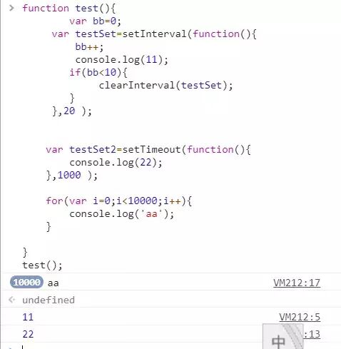 长话短说,我们需要记住的是:因为js是单线程的,浏览器遇到setTimeout或者setInterval会先执行完当前的代码块,在此之前会把定时器推入浏览器的待执行事件队列里面,等到浏览器执行完当前代码之后会看一下事件队列里面有没有任务,有的话才执行定时器的代码。 所以即使把定时器的时间设置为0还是会先执行当前的一些代码。
