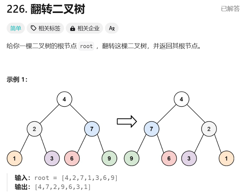 解题思路:前序遍历,然后将每个非空节点的左右子树交换(java要创建tmp变量交换),最后返回交换后的root;或者也可以创建一个新的二叉树节点然后赋值(比较麻烦)