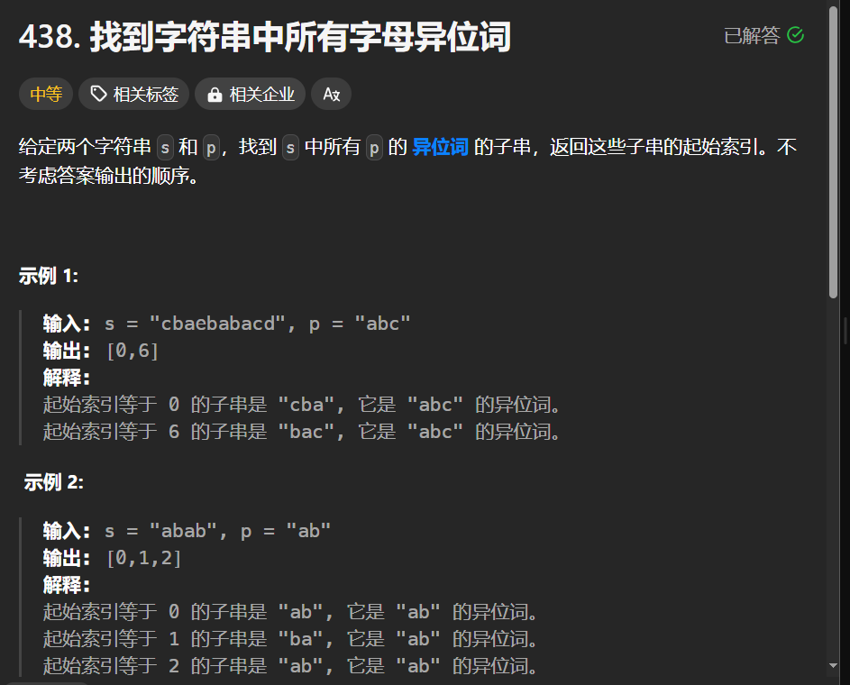 解题思路:还是滑动窗口题,主要是如何记录p内所有字符的情况,一种方法就是用2个长26的数组,用'str'-a对数组加值,先把p的那个数组确定,然后用end遍历S,每进一个对应的数组的值就加1,如果长度超过p就把start的对应的值减1,然后start++,如果最后长度等于p,那就比较两个数组,相同的话就把start的值加到结果列表中,最后返回。我的想法是当窗口达到后,用sort排序,如果和排序后的p相同放进去,时间更长。