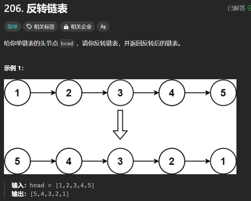 解题思路:熟能生巧,链表问题就是用指针来模拟,链表反转很经典,利用三个指针,两个指着head,一个指着null,然后模拟。