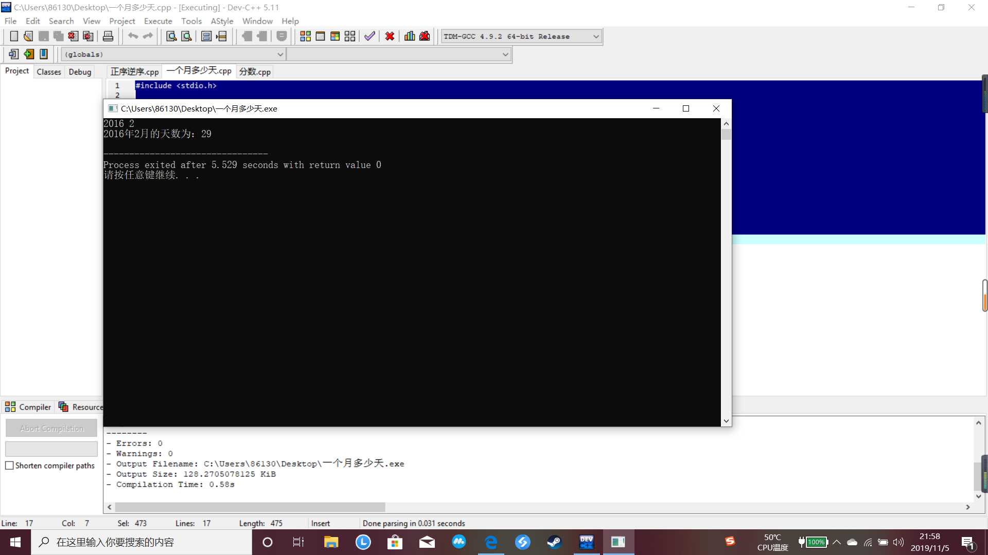 printf("%d年%d月的天数为:%d\n",year,month,day);
