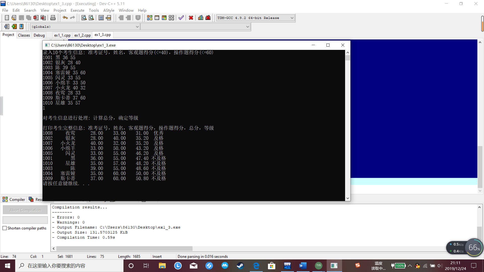 printf("\n打印考生完整信息: 准考证号,姓名,客观题得分,操作题得分,总分,等级\n");