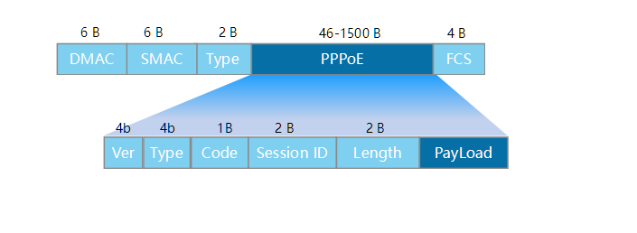 Type:表示协议类型字段,当值为0x8863时表示承载的是PPPoE发现阶段的报文。当值为0x8864时表示承载的是PPPoE会话阶段的报文。