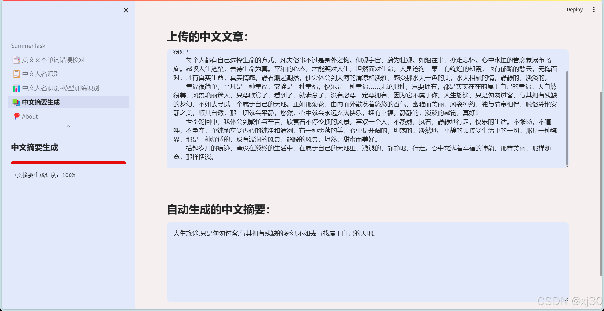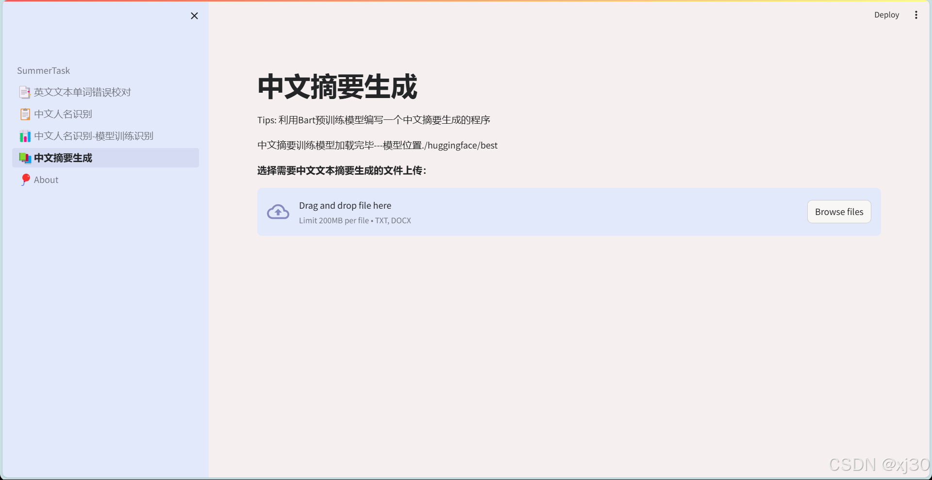 本项目在huggingface上的fnlp/bart-base-chinese预训练模型基础上,在数据集nlpcc_data.json上跑通一遍训练流程。包括下载已经训练好的模型,部署服务,也包括借鉴代码完整跑一边训练流程,实现中文文本摘要生成,完成可视化界面输出。