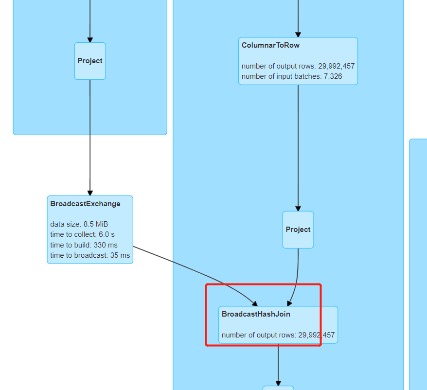 可以看到多出了一个broadcast exchange的stage,此操作就是广播小表的操作。这个stage在spark3.0中会显示,2.x系列版本中不会显示。join产生shffle task的个数为36的stage只剩下一个了,说明一个join的stage已经被优化掉了。再来查看执行计划图。