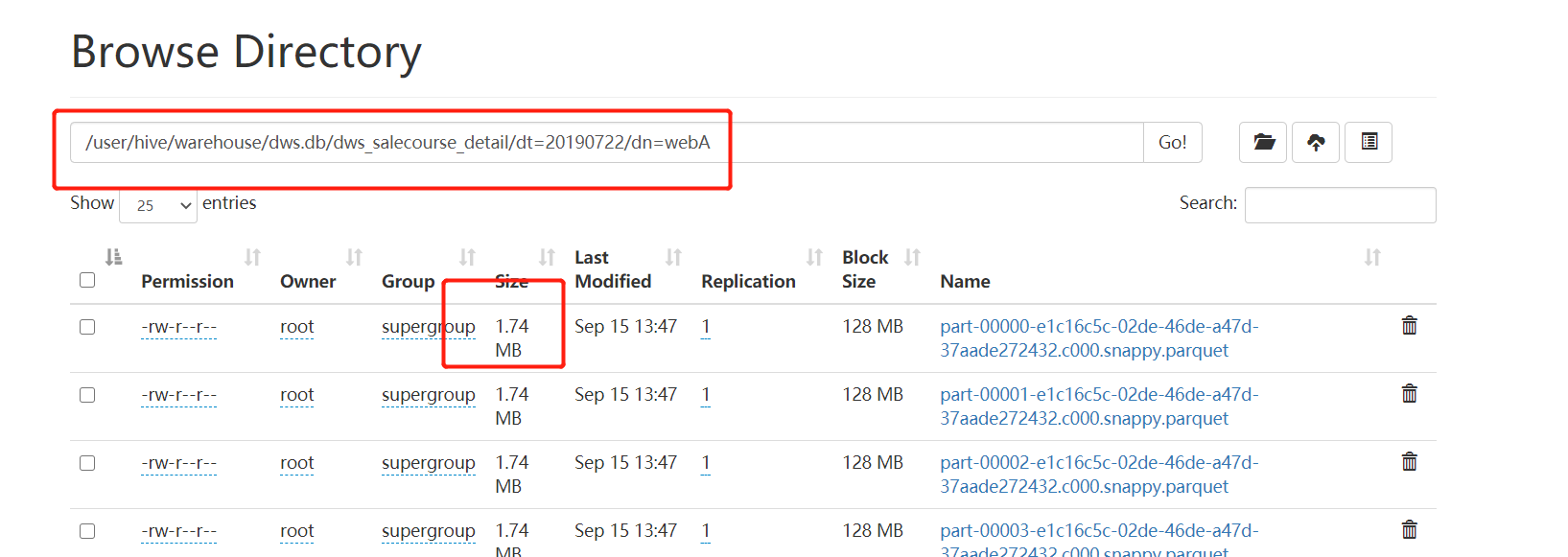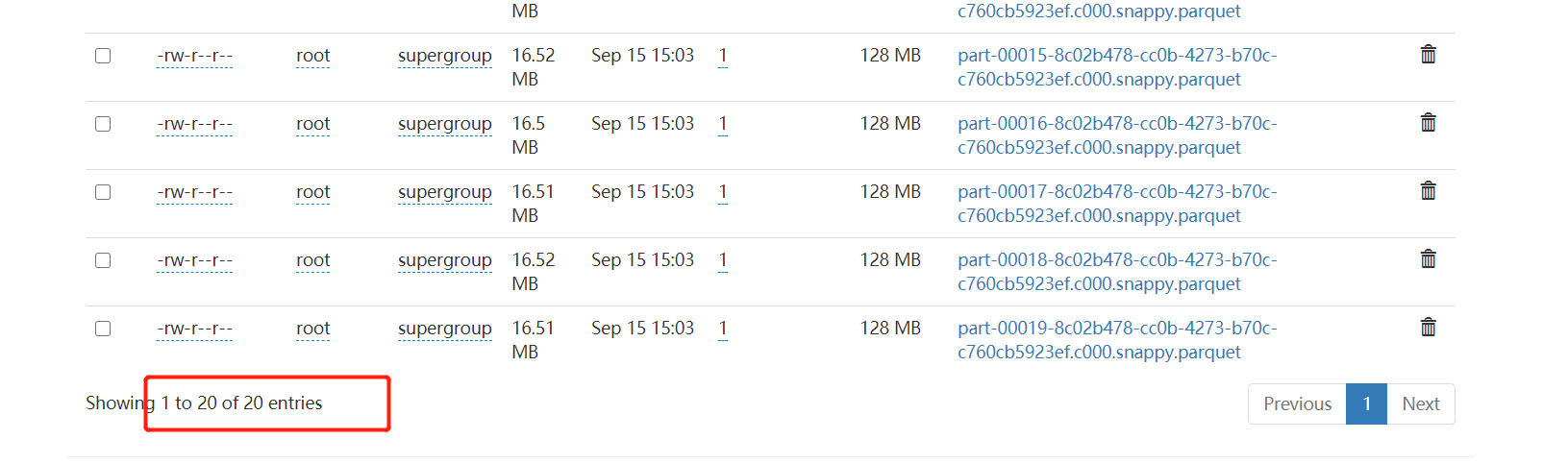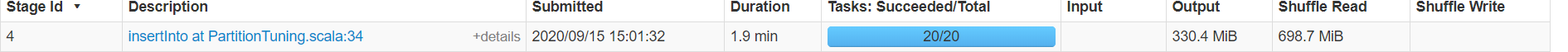 修改参数后,打成jar包重新在yarn上运行此任务。最后write阶段分区个数是20,再来看对应hdfs路径下产生的文件个数。