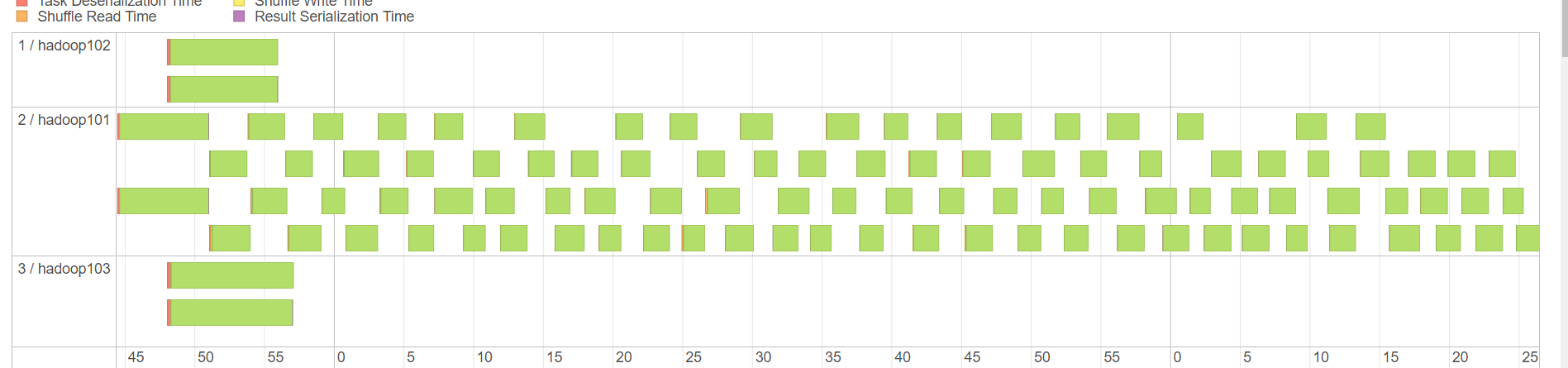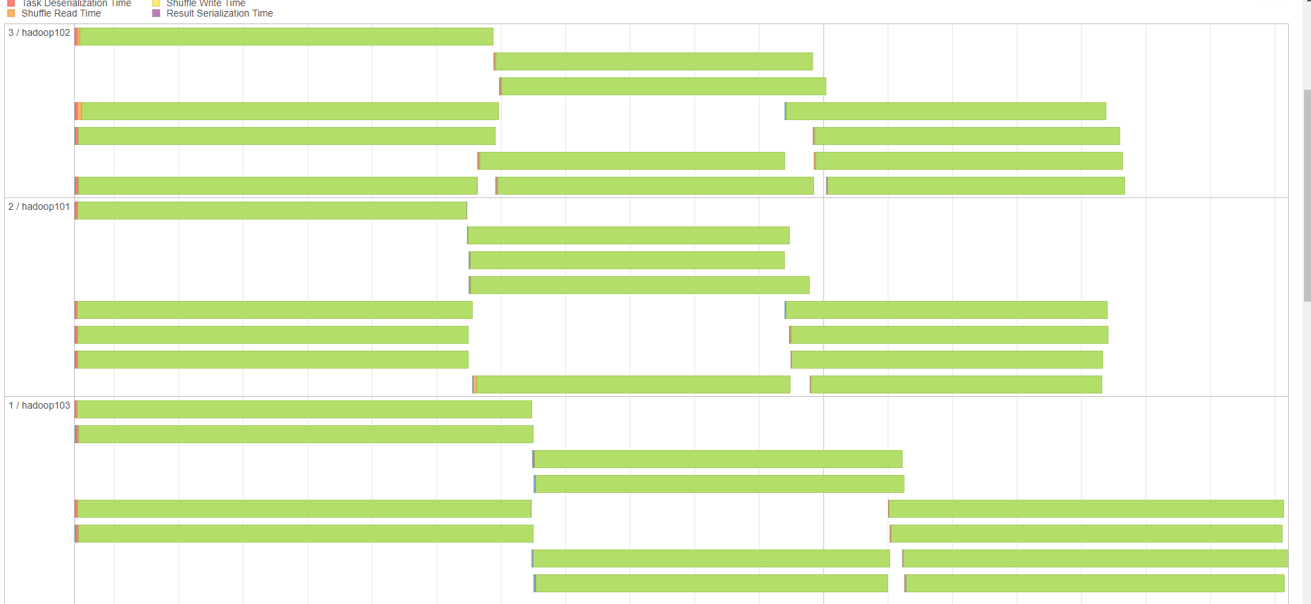 这张图就很明显了,分别hadoop101,hadop102,hadoop103各自申请到4个vcore,然后每个vcore都分配到了3个任务,也都是差不多时间点结束。充分利用了cpu的资源。