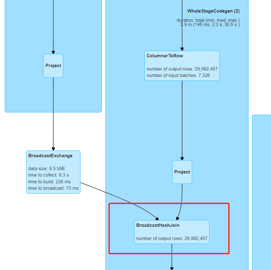 第一个小表join大表的stage从sortmerge join转换为了broadcast hashjoin.