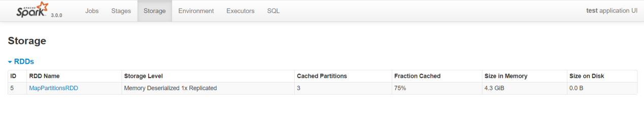 通过spark ui看到,rdd使用默认cache缓存级别,占用内存4.3GB,并且storage内存还不够,只缓存了75%