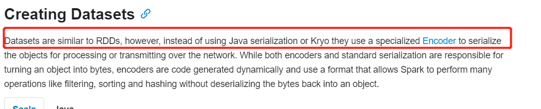 根据官网描述,DataSet类似RDD,但是并不使用JAVA序列化也不使用Kryo序列化,而是使用一种特有的编码器进行序列化对象。那么来使用DataSet进行缓存