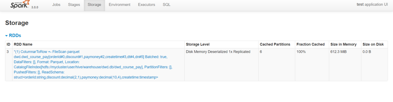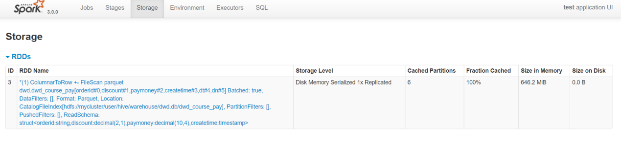 打成jar包,提交yarn。查看spark ui,storage占用内存646.2mb。和默认cache缓存级别差别不大。所以Dataframe可以直接使用cache。