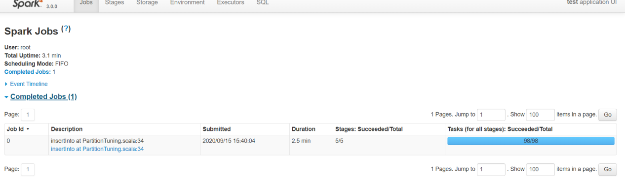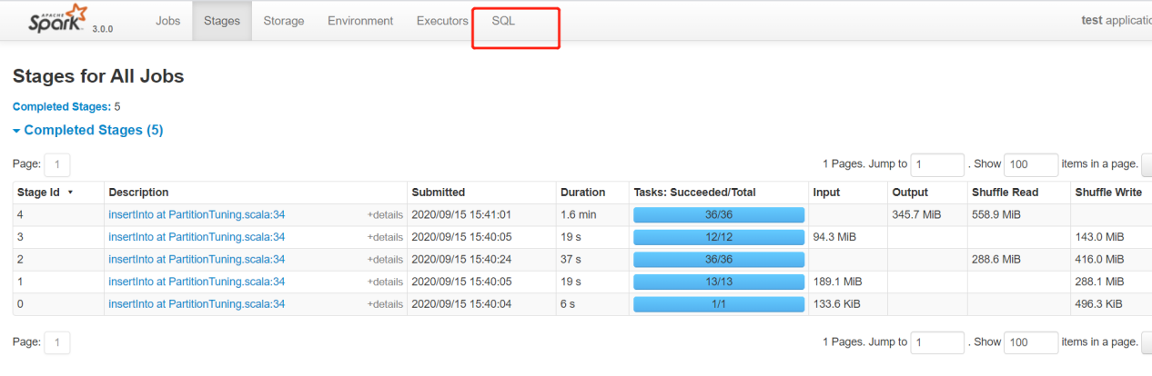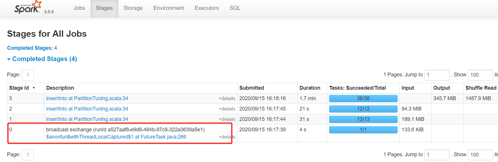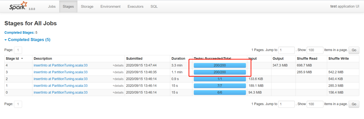 可以看到有2个stage的分区个数是200,这两个stage分别对应代码两处join。再往里面点击查看task的运行情况。