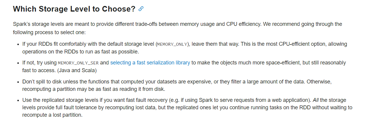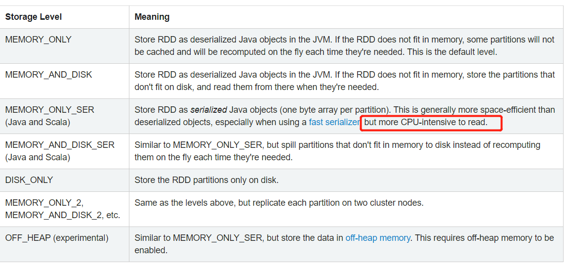 根据官网的描述,那么可以推断出,如果yarn内存资源充足情况下,使用默认级别MEMORY_ONLY是对CPU的支持最好的。但是序列化缓存可以让体积更小,那么当yarn内存资源不充足情况下可以考虑使用MEMORY_ONLY_SER配合kryo使用序列化缓存。
