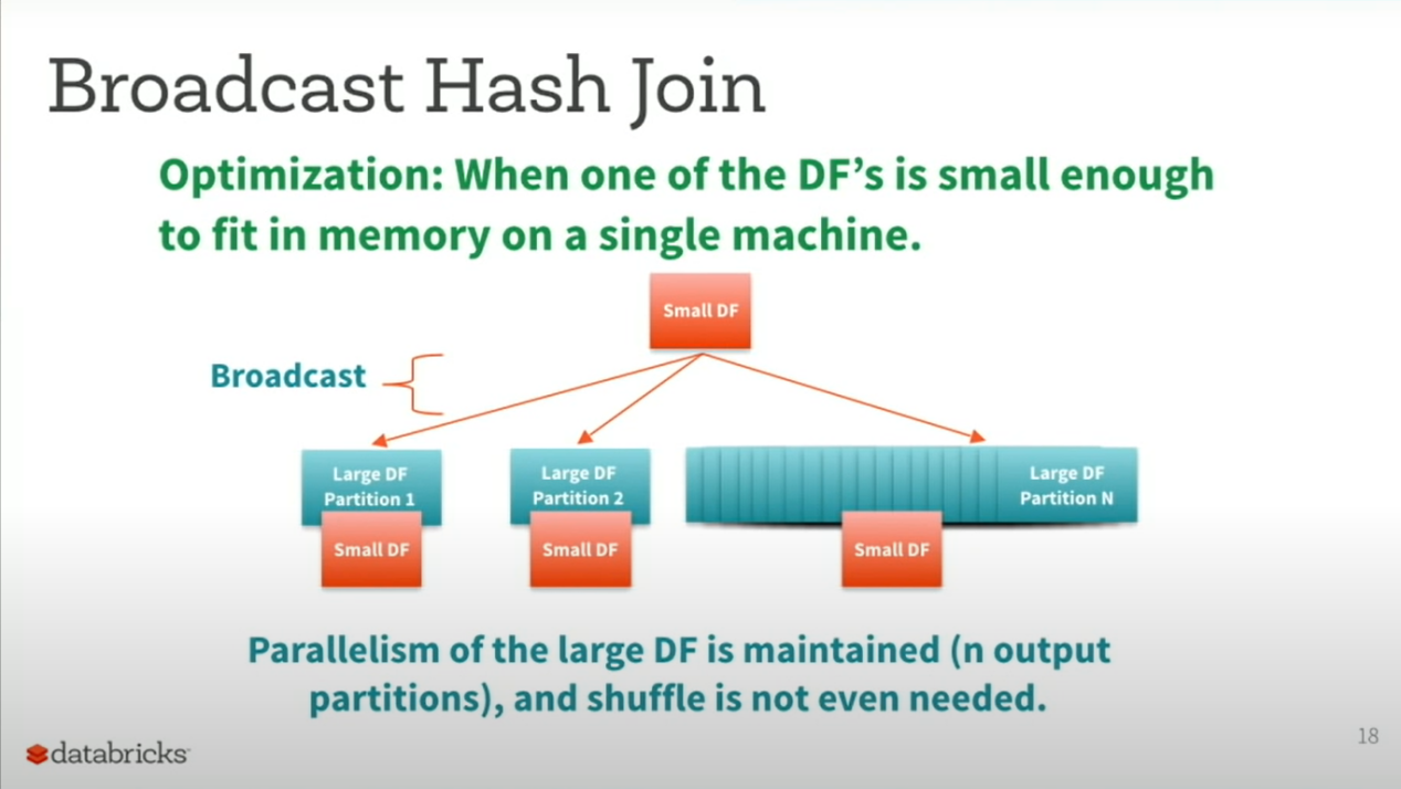 Spark join策略中,如果当一张小表足够小并且可以先缓存到内存中,那么可以使用Broadcast Hash Join,其原理就是先将小表聚合到driver端,再由driver端广播分发到各个大表分区中,那么再次进行join的时候,就相当于大表的各自分区的数据与小表进行本地join,从而规避了shuffle。