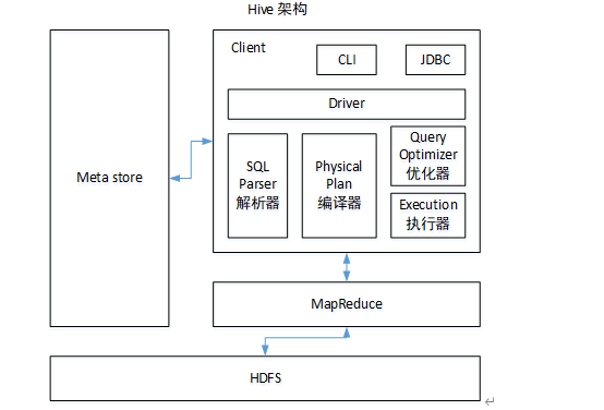CLI(command-line interface如开启bin/hive)、JDBC/ODBC(hiveserver2方式,jdbc访问hive,如beeline)、WEBUI(浏览器访问hive)
