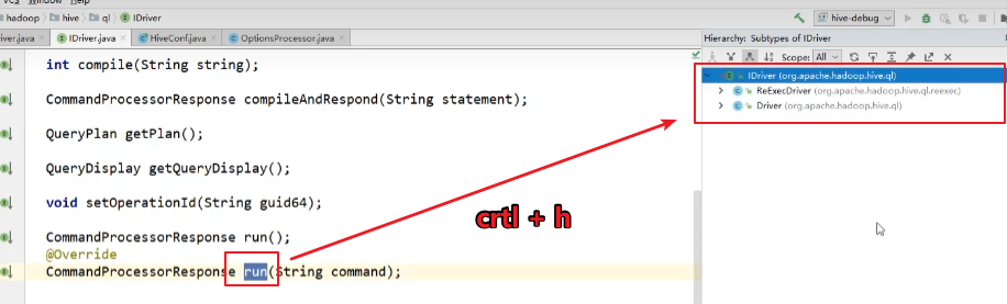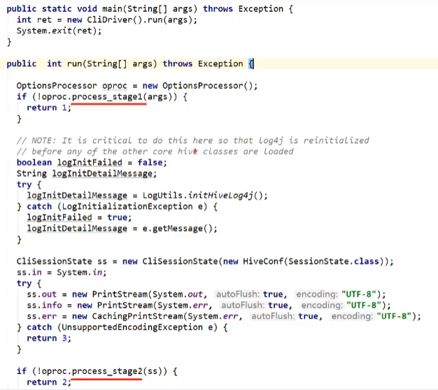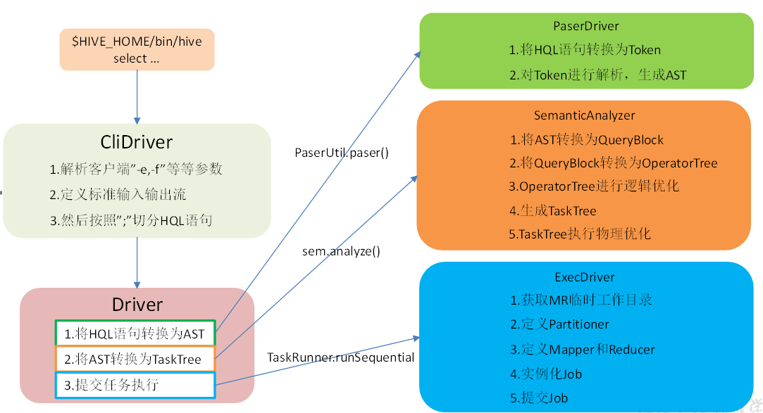 可以知道我们执行HQL主要依赖于$HIVE_HOME/bin/hive和$HIVE_HOME/bin/ hivesever2两种脚本来实现提交HQL,而在这两个脚本中,最终启动的JAVA程序的主类为“org.apache.hadoop.hive.cli.CliDriver”,所以其实Hive程序的入口就是“CliDriver”这个类。