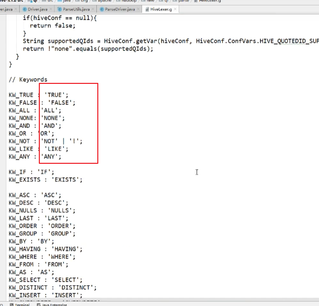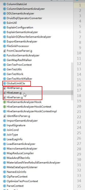 Hive中语法规则的定义文件在0.10版本以前是Hive.g一个文件,随着语法规则越来越复杂,由语法规则生成的Java解析类可能超过Java类文件的最大上限,0.11版本将Hive.g拆成了5个文件,词法规则HiveLexer.g和语法规则的4个文件SelectClauseParser.g,FromClauseParser.g,IdentifiersParser.g,HiveParser.g。
