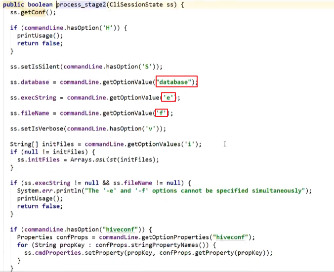 //解析用户参数,包含"-e -f -v -database"等等.点击process_stage2跳转,图中框选的为解析输入的用户参数,数据库,-e -f等等。