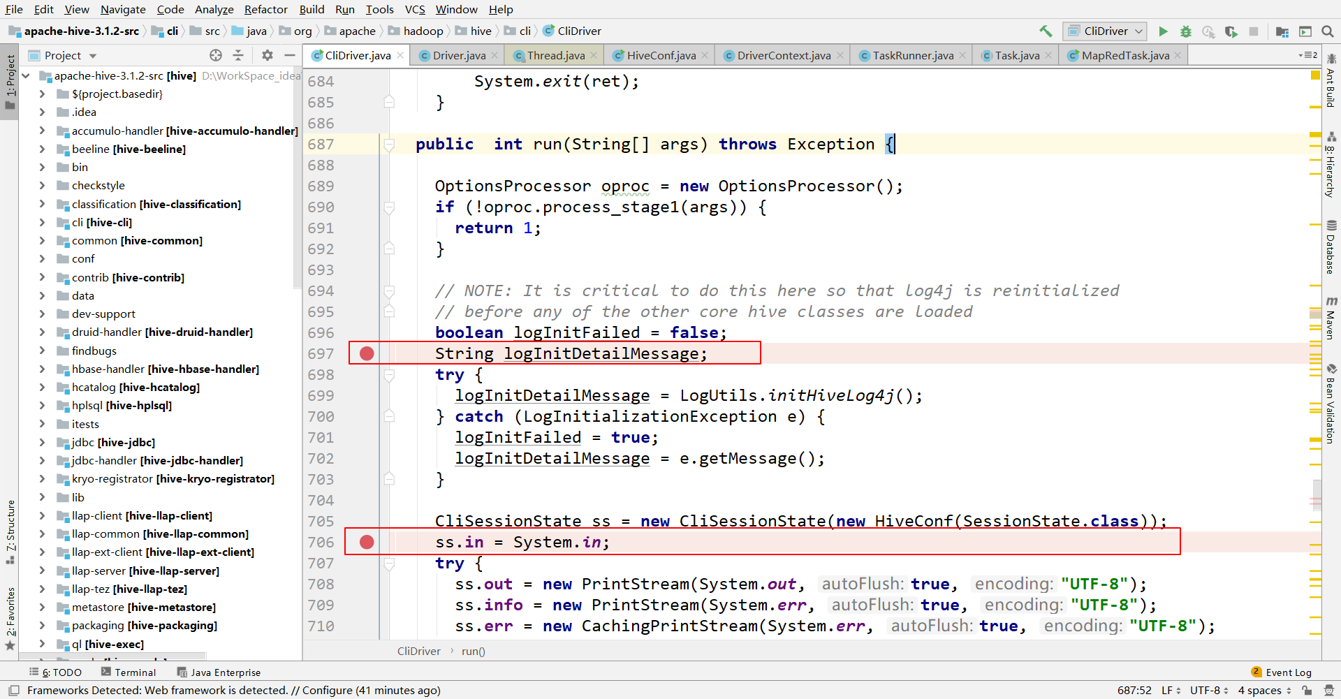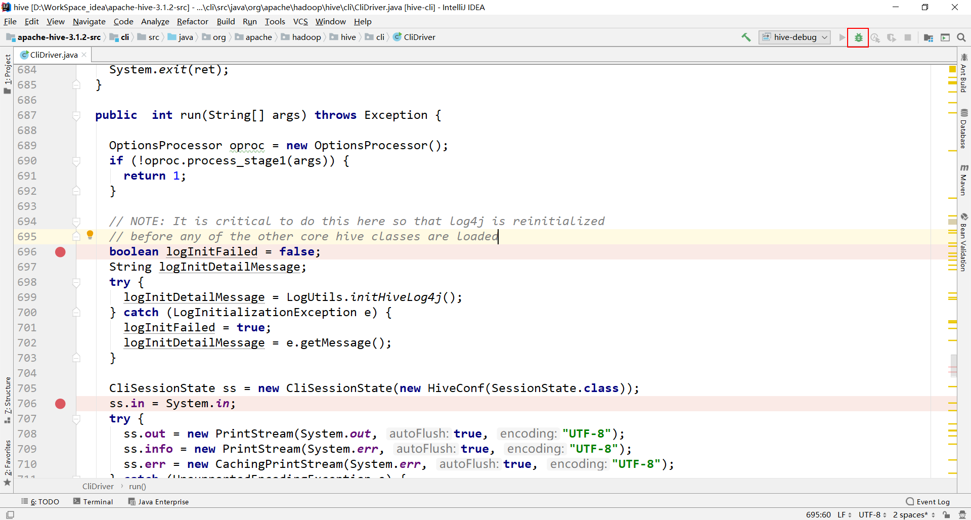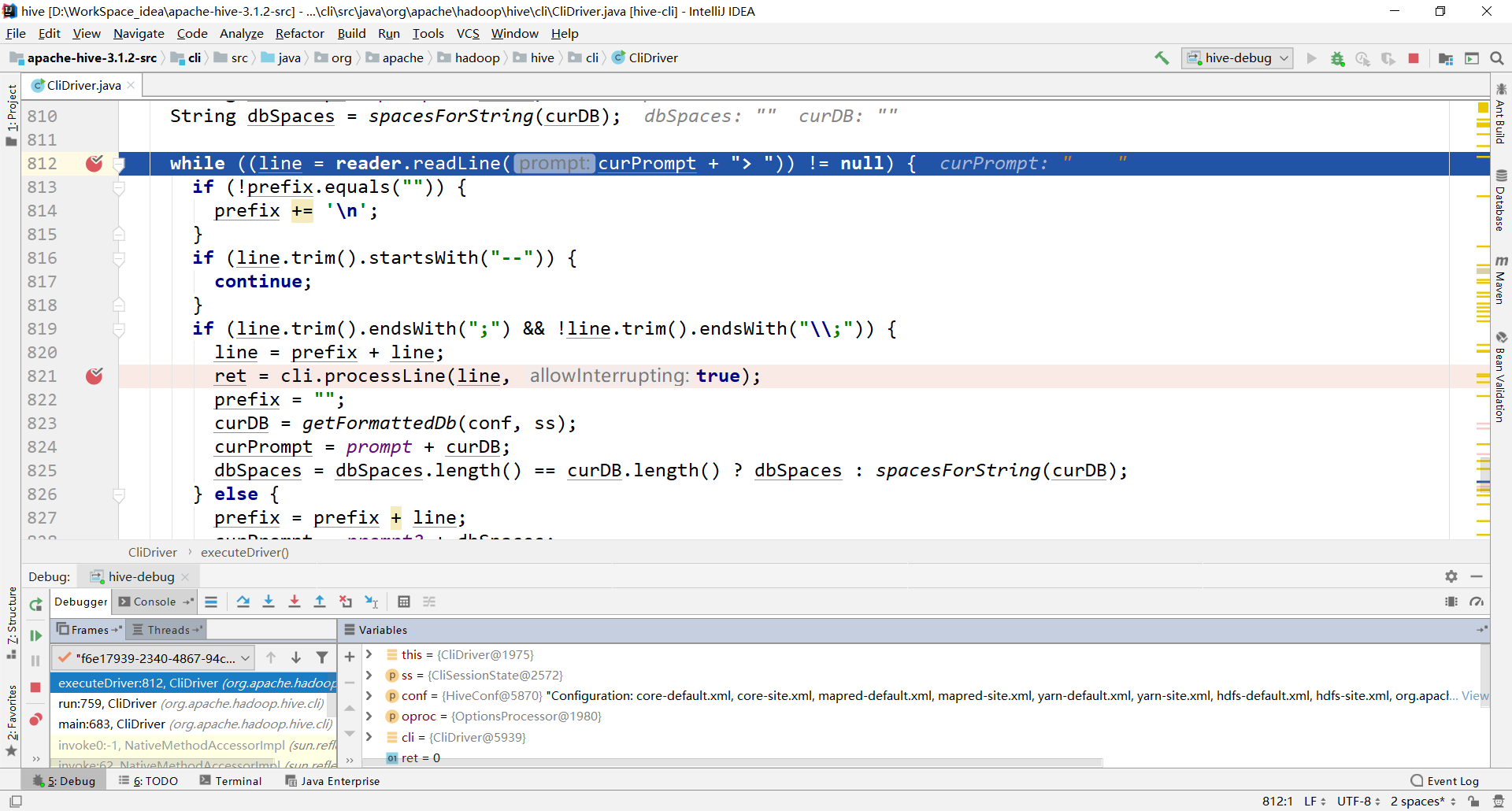 3.2.1 在CliDriver类的run方法中随意打上断点