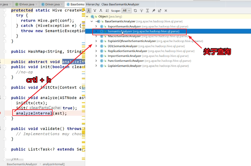 此方法为“org.apache.hadoop.hive.ql.parse.BaseSemanticAnalyzer”抽象类的抽象方法,我们进入实现类“org.apache.hadoop.hive.ql.parse.SemanticAnalyzer”的analyzeInternal方法。