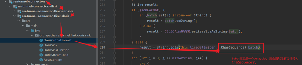 通过最后打印的栈追踪信息,我们可以知道出错的位置在DorisOutPutFormat.java文件的第210行,于是我们需要去idea里面打开源码看一下这里的代码是怎么写的。