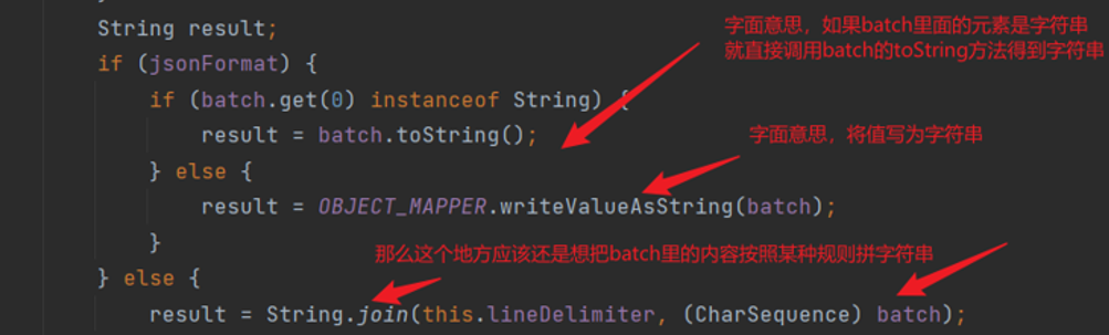 这需要一定的背景知识,SeaTunnel的dorisSink其实是依托于doris的stream load这种导入方式来实现的。而stream load其实是通过http请求的形式,向doris导入数据。而且doris提倡提交数据的时候一定要成批地向doris导入数据。如此一来,我们知道bacth就是用来积攒数据的一个集合,而向远端通过http发送数据必然要经过一个序列化的过程。结合上下文来看,我们可以判断这段代码的目的,就是要将batch里的所有数据,按照某个规则转为字符串,为http请求做准备。分析过程如图所示。