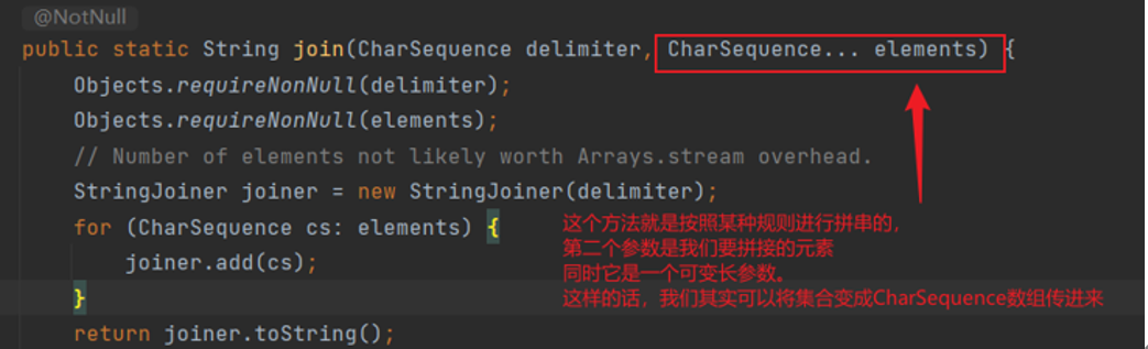 我们发现,join方法的第二个参数是一个CharSequence类型的可变长参数,这意味着我们可以向里面传递一个CharSequence类型的数组。那么代码可以修改成下面这个样子。
