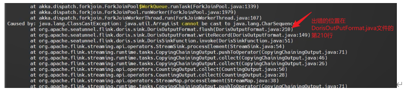 当时,向doris插入数据时会抛出一个ClassCastException,也就是类型的强转错误。这里会报Java.Util.ArratList不能强转为java.lang.CharSequence。在反复确认我们的配置文件写的没问题后。我们仔细阅读了一下控制台打印的栈追踪信息。