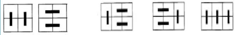 (4)当n=3时:骨牌可以全部竖排,也可以认为在方格中已经有一个竖排骨牌,则需要在方格中排列两个横排骨牌(无重复方法),若已经在方格中排列两个横排骨牌,则必须在方格中排列一个竖排骨牌。如上右图,再无其他排列方法,因此铺法总数表示为x3=3。
