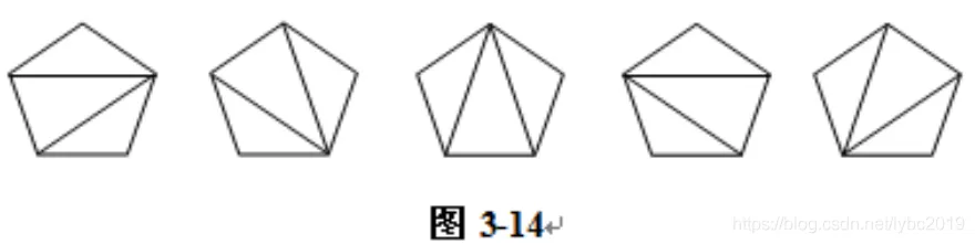 问题的提出:在一个凸n边形中,通过不相交于n边形内部的对角线,把n边形拆分成若干三角形,不同的拆分数目用hn表示,hn即为Catalan数。例如五边形有如下五种拆分方案(图3-14),故h5=5。求对于一个任意的凸n边形相应的hn。
