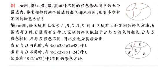 本质逻辑:通过“分步”确定前序区域涂色,再“分类”处理后序区域的依赖关系(\( B \) 与 \( D \) 颜色是否相同),覆盖所有可能的涂色路径,最终算出结果。