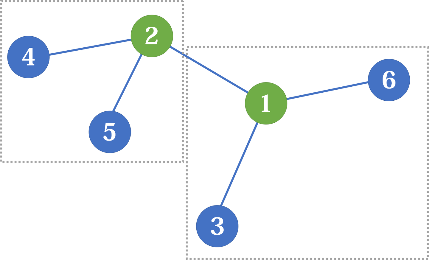 由上述条件,我们知道 。而我们又有 ,于是 。所以,在有两个重心时,树的大小一定是偶数,且可以被划分为两个大小相等的分支,每个分支各自包含一个重心。