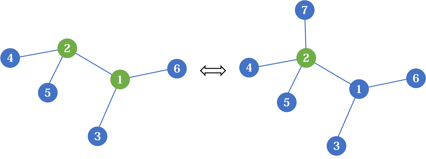 增加一个叶子,节点数变成 。如果此时原来的某个重心不再是重心,那么添加叶子的那棵子树原来的节点数一定大于 ,只有节点数等于 的子树才符合要求,这时 只能是偶数。往这棵子树上添加一个节点后,这棵子树的根节点(“另一个重心”)仍然是重心,它拥有一个节点数为 的子树和另外一系列节点数总和为 的子树,均小于 。