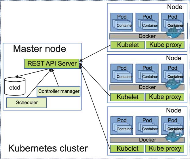 Kubernetes中的集计算,存储,网络,信息与资源的集合,即Kubernetes所在运行的整体应用,其通常包括若干个master节点和工作节点,并在各节点中保存对应的应用与资源集合,如上图所示。