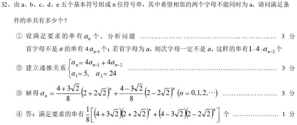 如果是直接用排列组合的话,应该是这个形式:\(5^n-\sum\limits_{d=2}^n\sum\limits_{k=1}^{\left\lceil\frac{n}{d+1}\right\rceil}4^{n-dk}\begin{pmatrix}(n-(d-1))-dk+d\\k\end{pmatrix}=5^n-\sum\limits_{d=2}^n\sum\limits_{k=1}^{\left\lceil\frac{n}{d+1}\right\rceil}4^{n-dk}\begin{pmatrix}n-dk+1\\k\end{pmatrix}\)