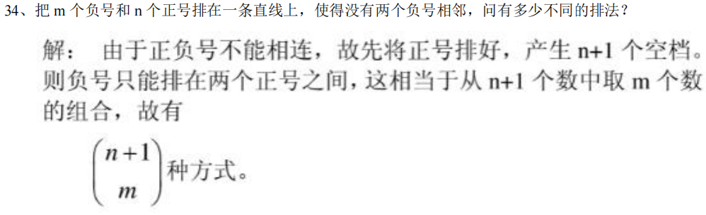 答案:线排列时的组合数是\(\begin{pmatrix}n+1-k\\k\end{pmatrix}\),环排列时的组合数是\(\frac{n}{n-k}\begin{pmatrix}n-k\\k\end{pmatrix}\),线排列而元素间间隔不小于\(d\)的组合数是\(\begin{pmatrix}n-(d-1)k+d-1\\k\end{pmatrix}\)