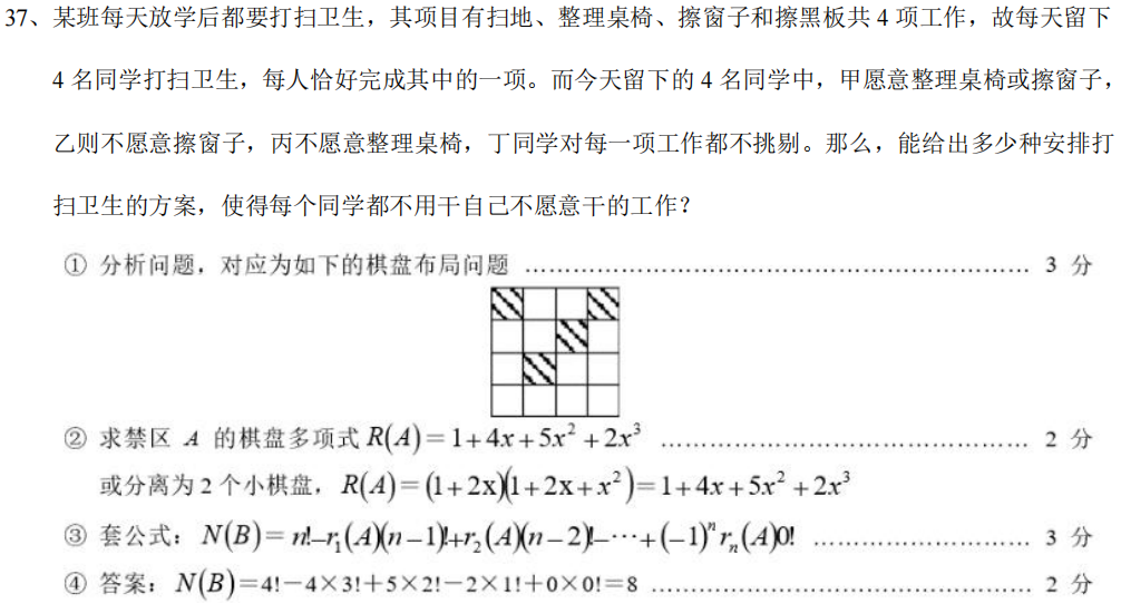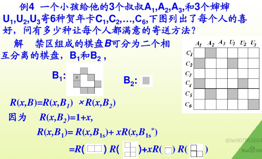 若在棋盘\(C\)中,\(r_k(C)\)可以考虑使用棋盘多项式求解,即\(R(C)=\sum\limits_{k=0}^nr_k(C)x^k\).