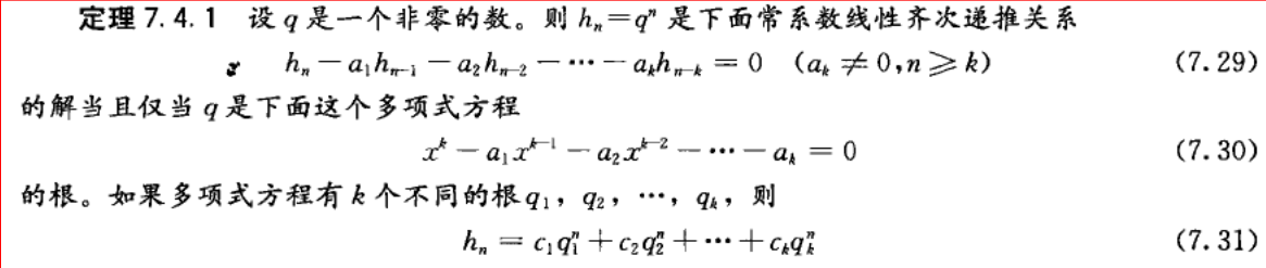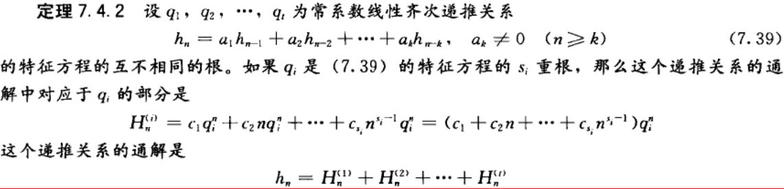 - 假设递推关系为\(\sum\limits_{i=0}^{t+1}k_ia_{n-i}=0\),则求得\(\left(\sum\limits_{i=0}^{t+1}k_ix^i\right)G(x)=\sum\limits_{i=0}^{t}\left(\sum\limits_{j=0}^{i}k_ja_{i-j}\right)x^i\)
